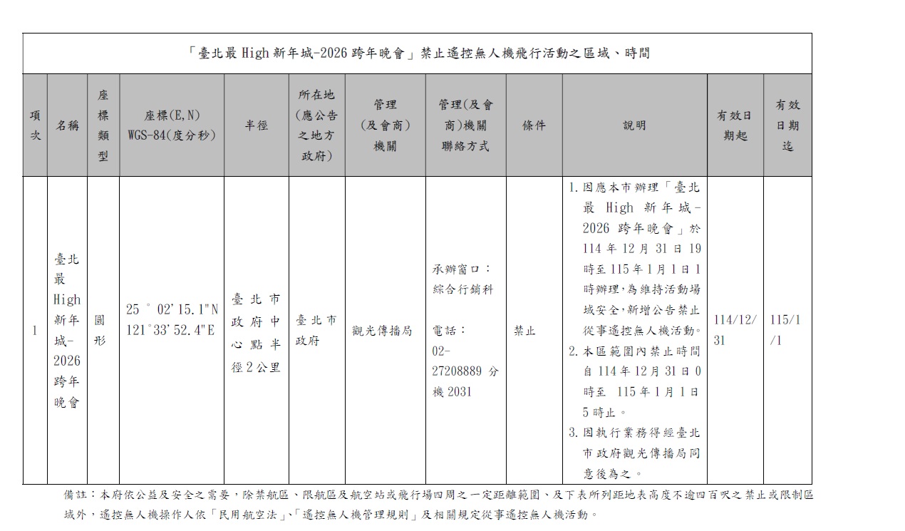 主旨:檢送本市「臺北最High新年城—2026跨年晚會」禁止遙控 無人機飛航活動公告、時間及範圍各1份,請查照。