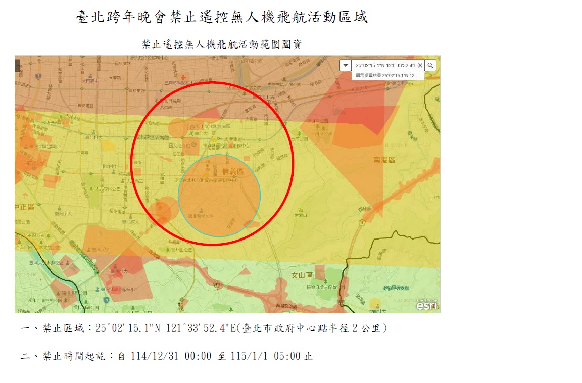 二、旨揭禁止區域為臺北市政府中心點半徑2公里,禁止時間自 114年12月31日0時至115年1月1日5時止。