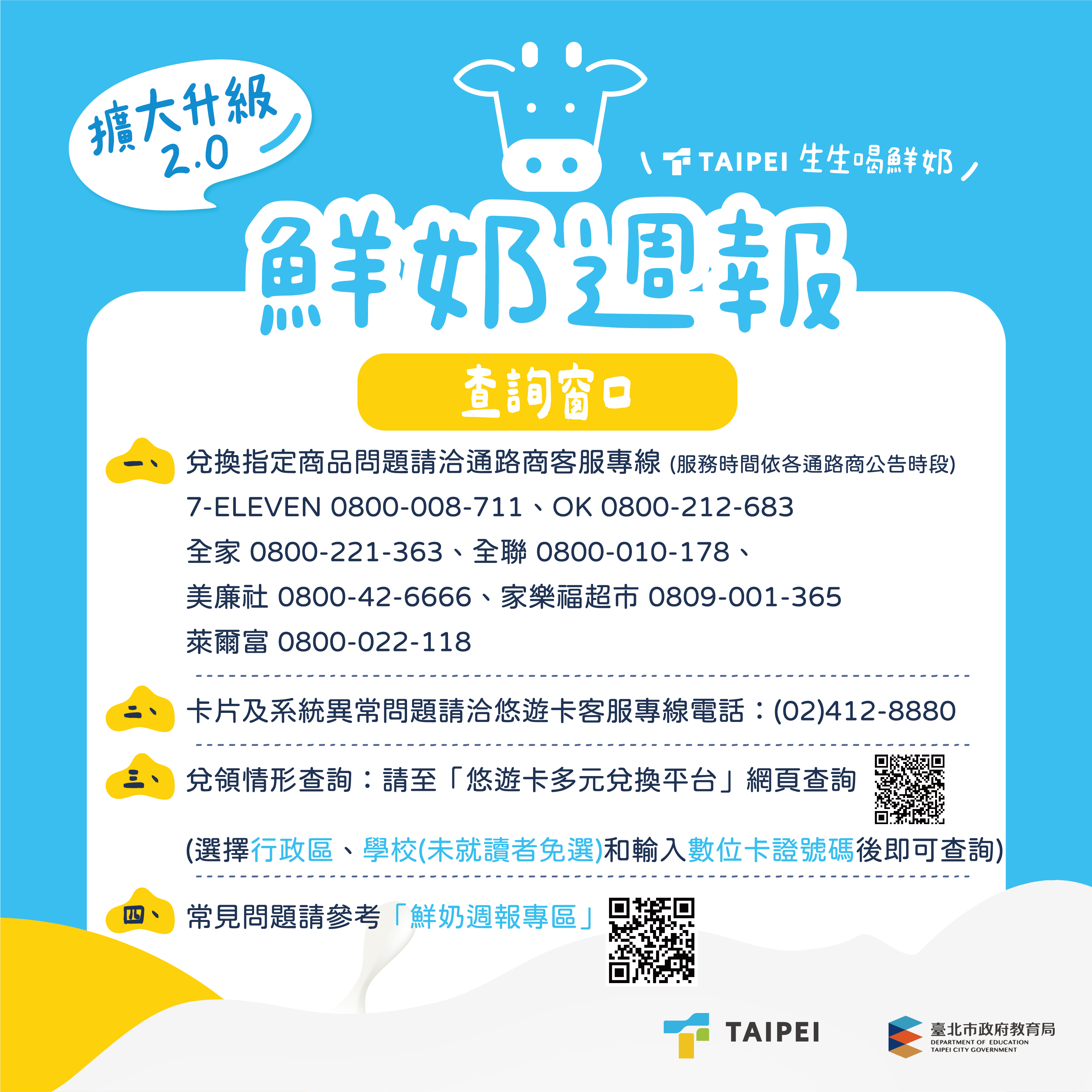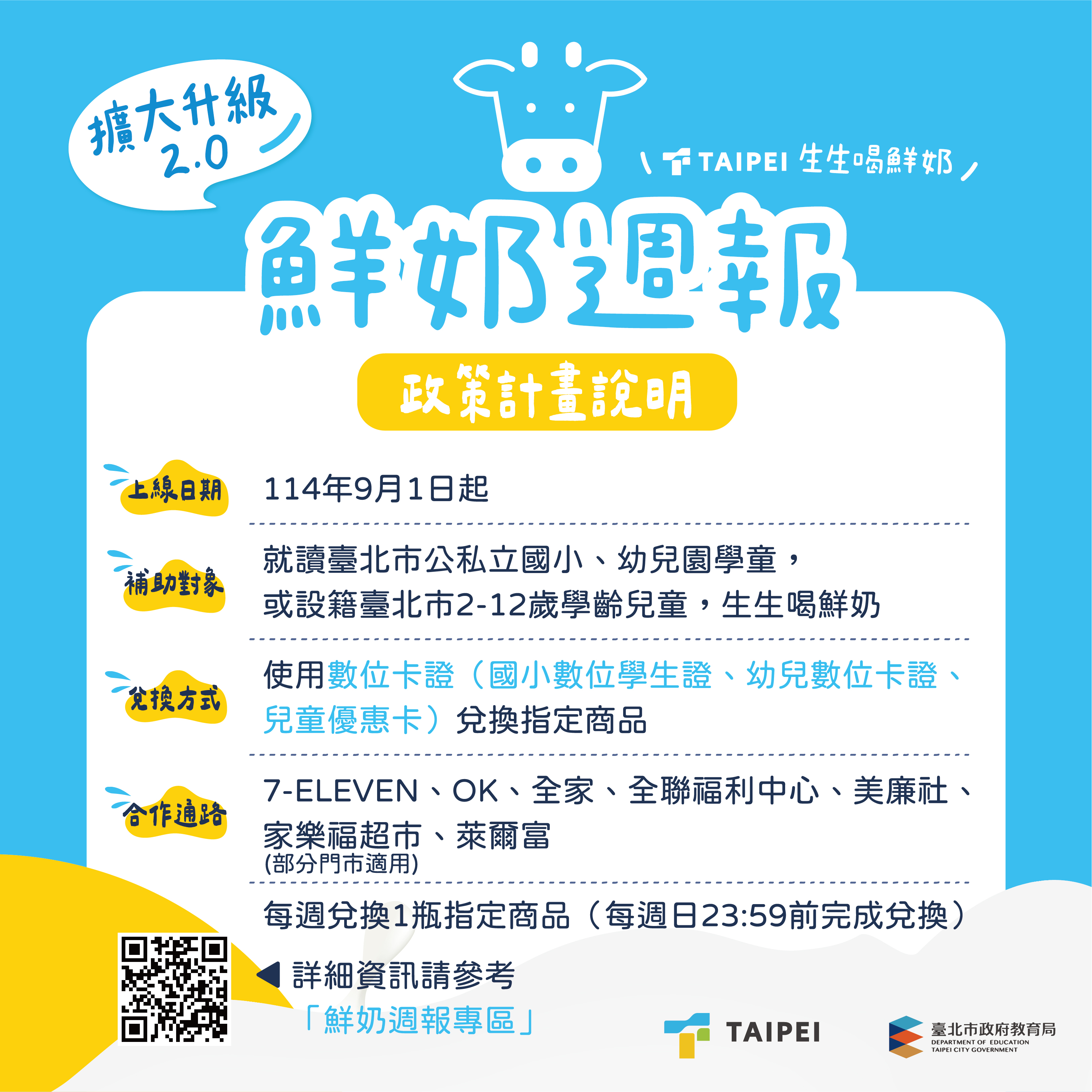 3.兌換通路、品項再擴充:家長或學童持指定的數位卡證,即可至全臺七大通路門市兌換,共計18項鮮奶、18項豆漿,讓營養補充成為日常簡單卻重要的習慣。