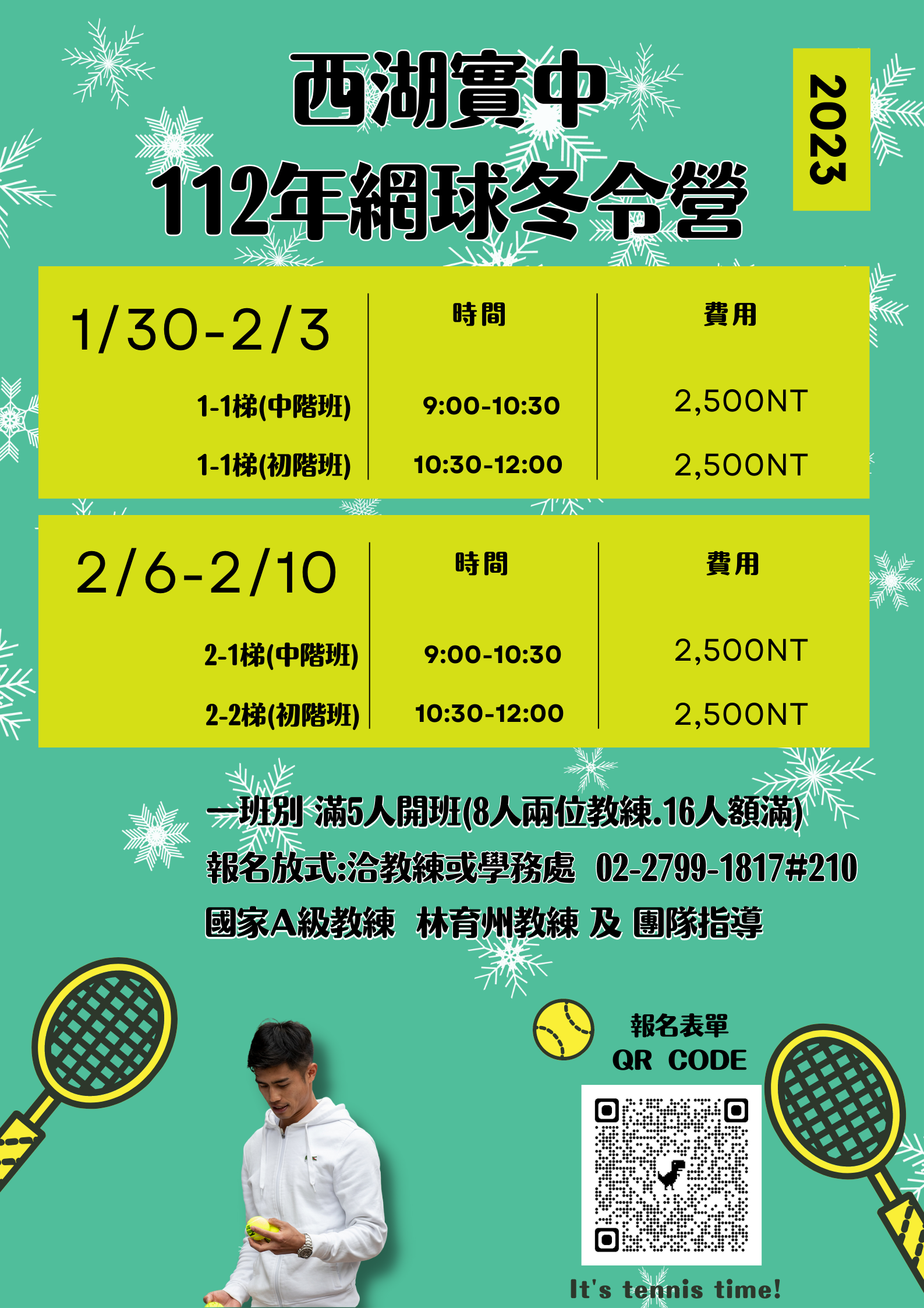 一、旨揭營隊摘要訊息如下: (一)營隊日期: 1、第1-1梯次(中階班,有網球經驗): 112年1月30日至2 月3日,上午9:00-10:30 2、第1-2梯次(初階班,無網球經驗): 112年1月30日至2 月3日,上午10:30-12:00 3、第2-1梯次(中階班,有網球經驗): 111年2月6日至2 月10日,上午9:00-10:30 4、第2-2梯次(初階班,無網球經驗): 111年2月6日至2 月10日,上午10:30-12:00 (二)參加對象:對網球有興趣之國小及國中七、八年級學 生。(三)報名期間、方式:111年12月26日起至112年1月6日中午 12時止,可利用網路報名、紙本親自報名或傳真報名等 方式,依報名先後順序錄取。 二、檢送本校112年度網球冬令營活動實施計畫暨報名表、活動 DM各1份。
