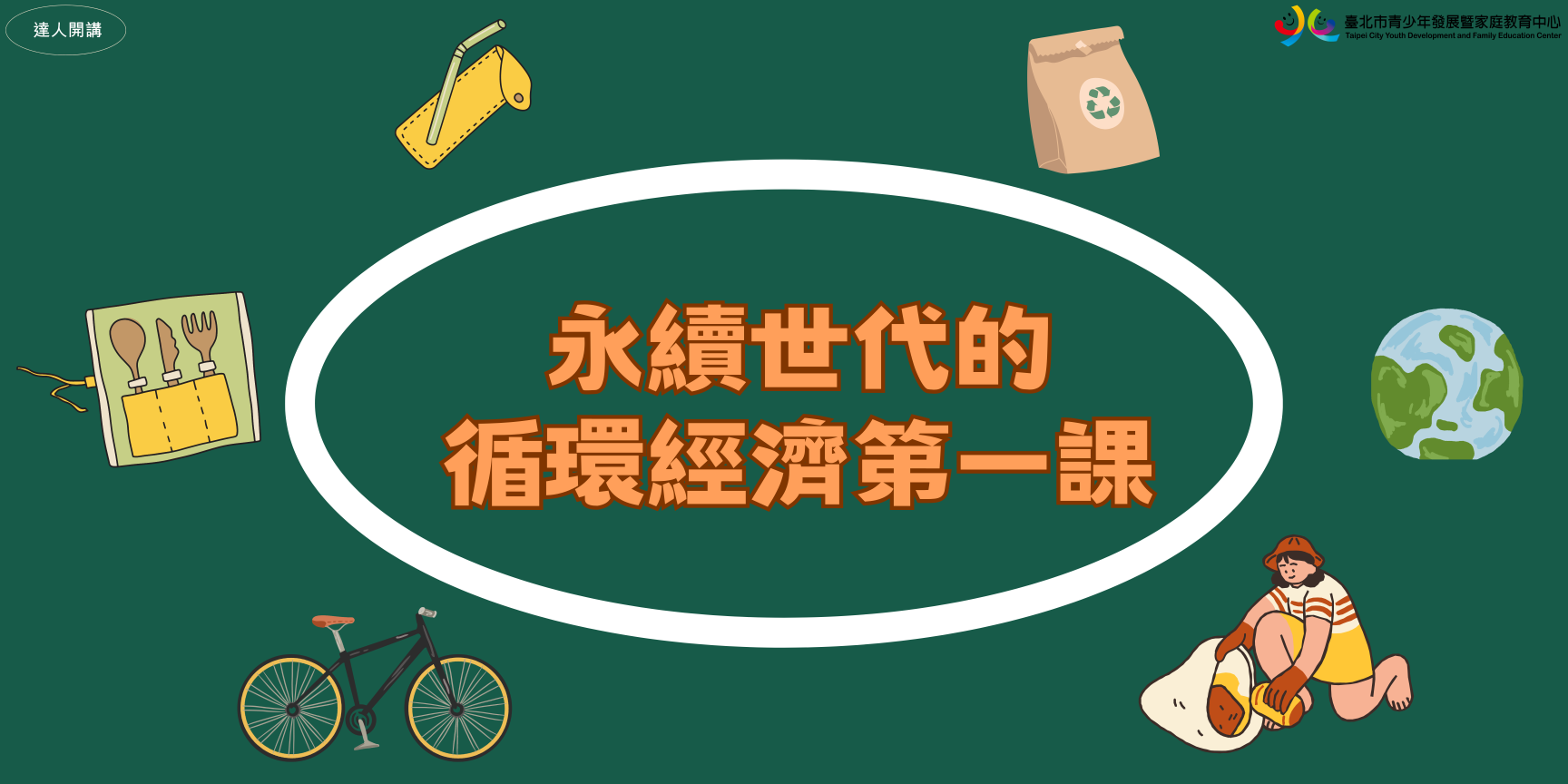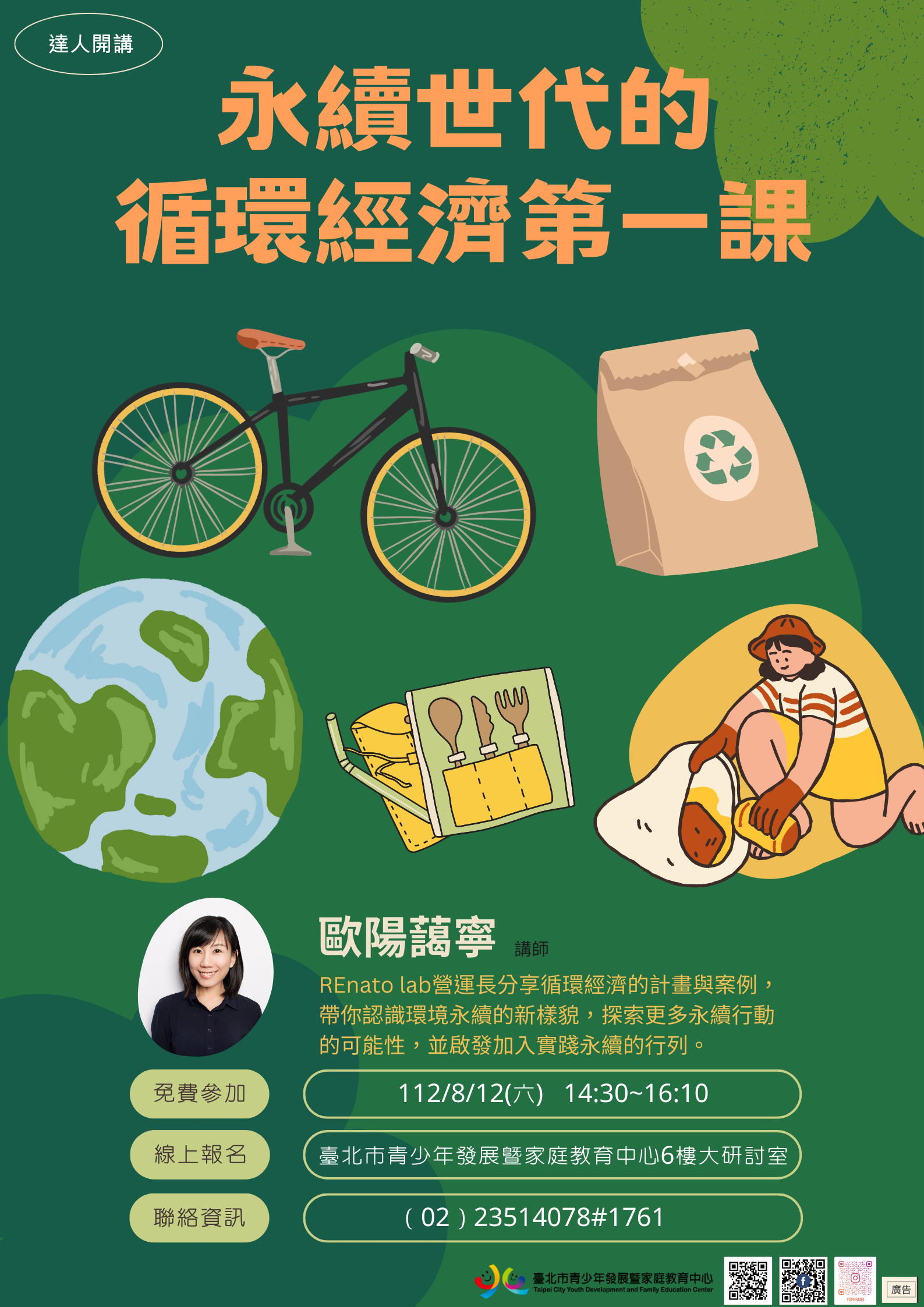 臺北市青少年發展暨家庭教育中心8月12日14:30舉辦達人開講「永續世代的循環經濟第一課」,REnatolab營運長歐陽藹寧老師與您分享她踏上致力於實踐永續的心路歷程,以及過程中的體驗。活動免費,詳見青發家教中心官網。