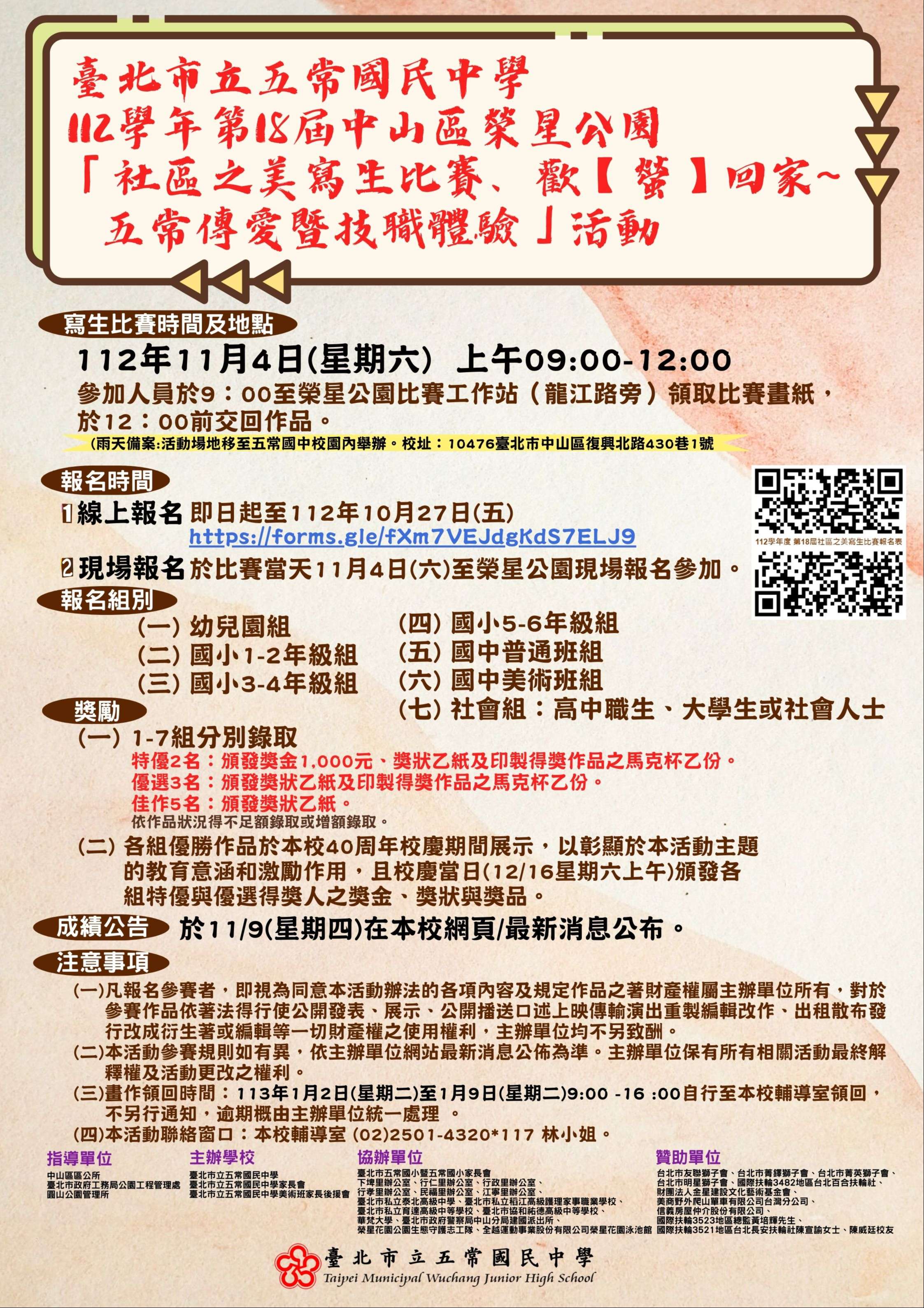 二、比賽地點:榮星公園內(臺北市中山區民權東路三段與龍江路口),若遇雨天照常舉行,比賽地點移至五常國中(臺北市中山區復興北路430巷1號)校內。