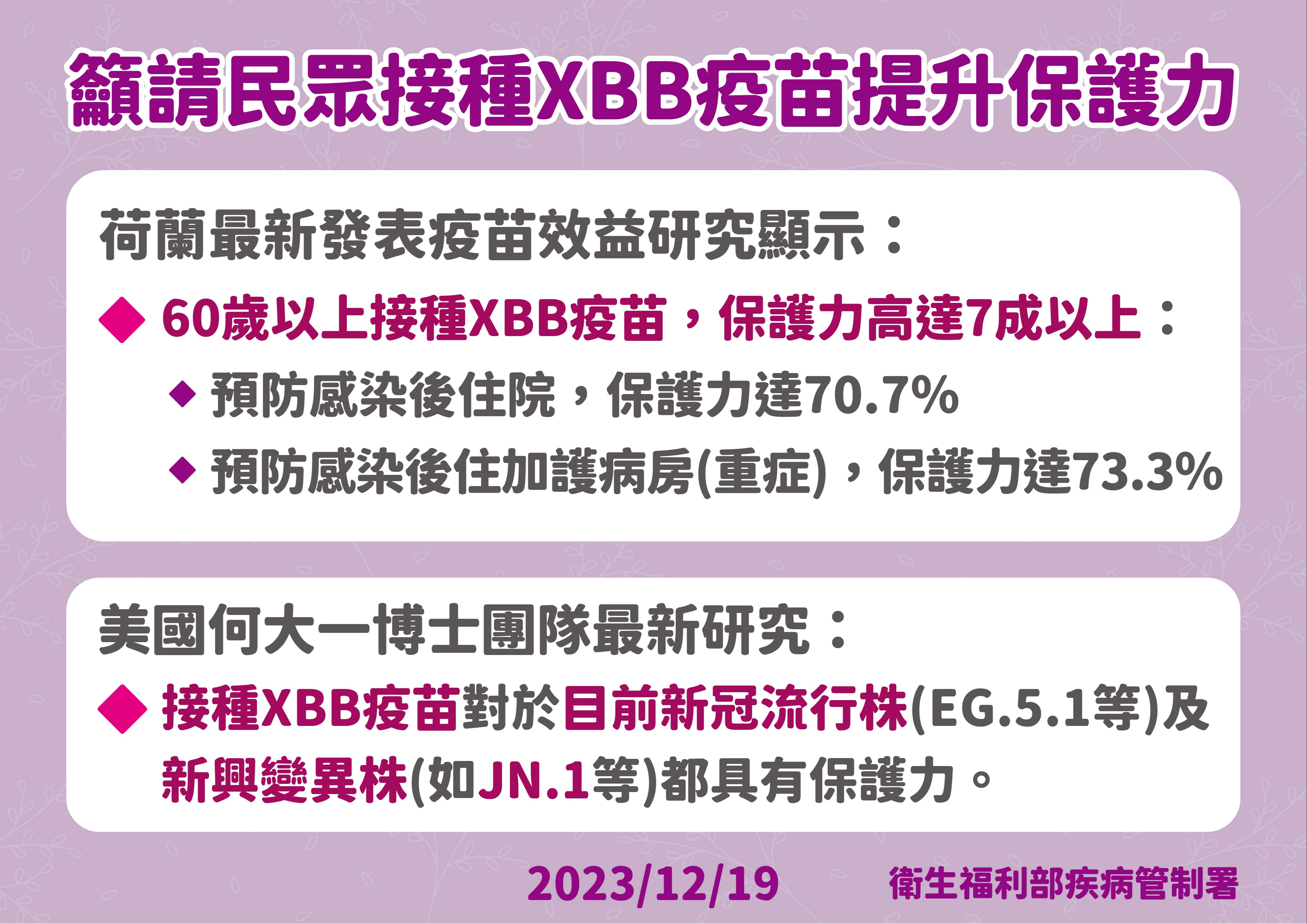 二、國內自112年10月11日起開放出生滿6個月以上民眾均可接種新冠XBB疫苗,依據臨床研究數據顯示,新冠XBB疫苗對於現流行之變異株及JN.1等新興變異株均有保護力,接種疫苗可提升免疫保護力,降低染疫後重症及死亡風險。