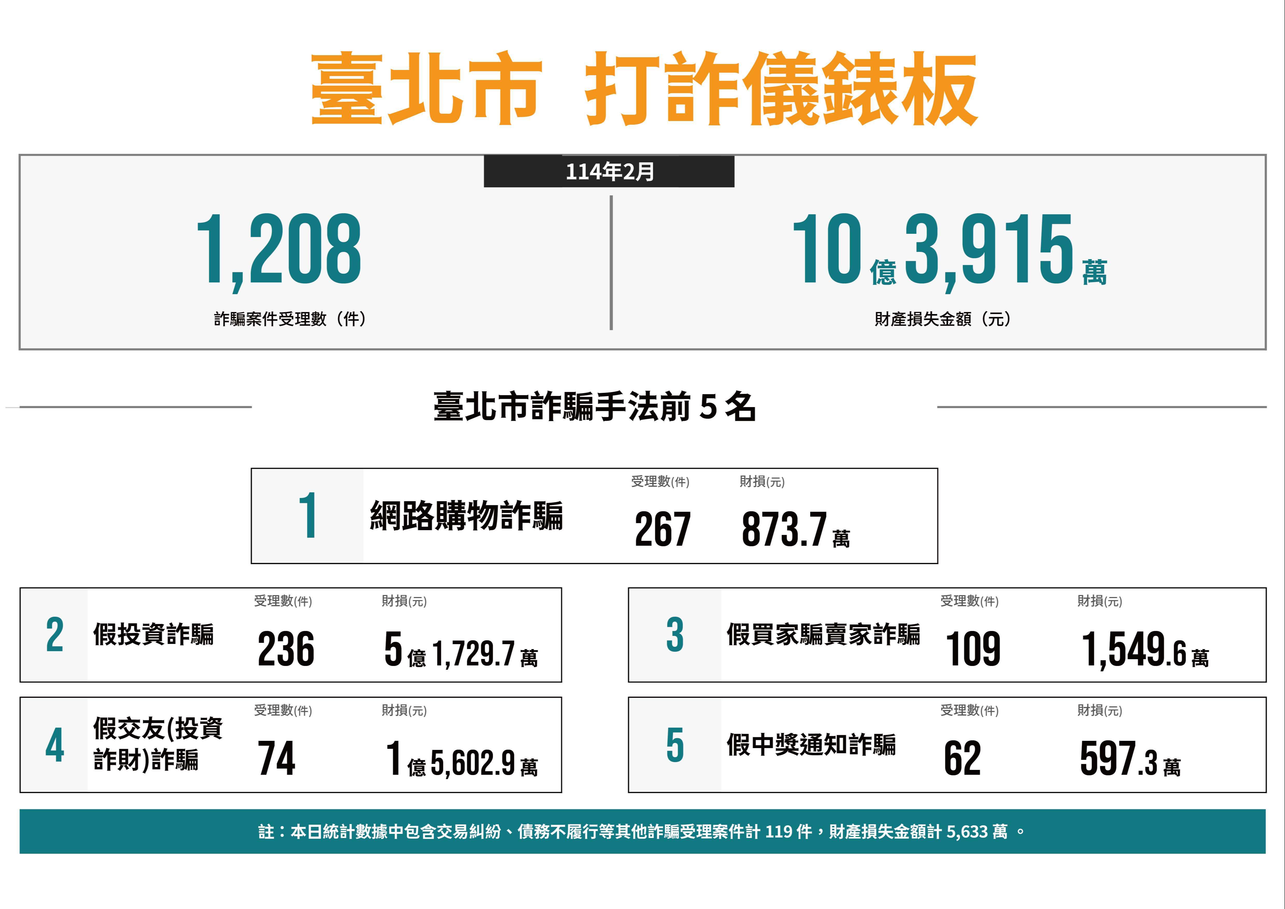 分析本市114年2月各類詐欺案件發生數共計1,208件,財損 新臺幣(以下同)10億3,915萬元,前3大詐欺手法之受理 件數及財損金額: