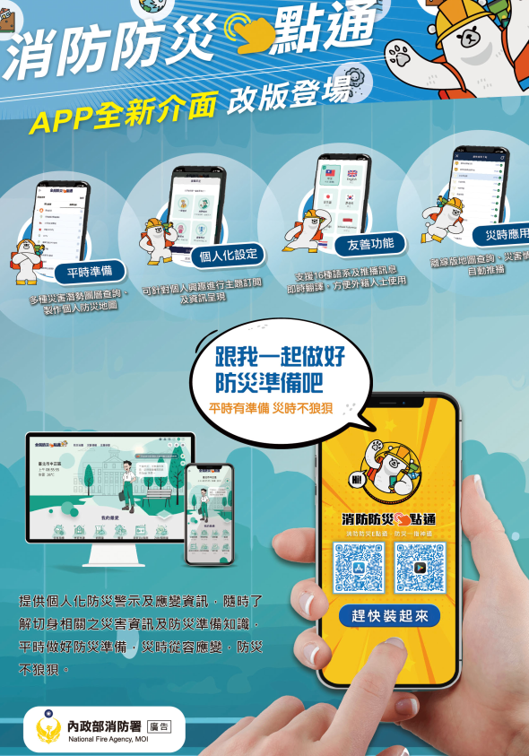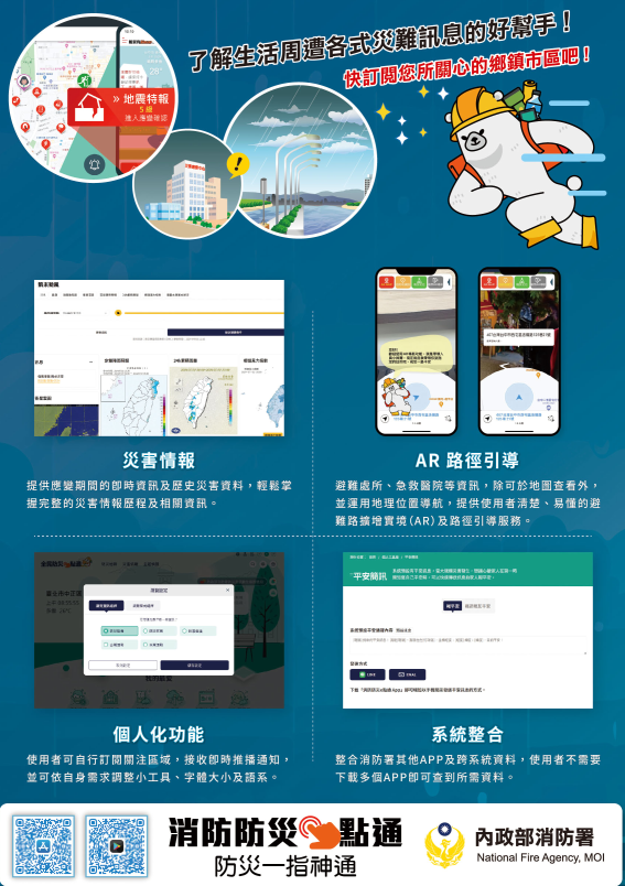 二、旨揭「全民防災e點通網站」及「消防防災e點通APP」由內政部消防署建置,具備災害示警推播、各類災害防救指 引、119報案定位、查詢鄰近避難處所及防空避難設施、提供避難路線建議等功能,並提供16種外國語言翻譯,可協助民眾即時掌握重要災防訊息。
