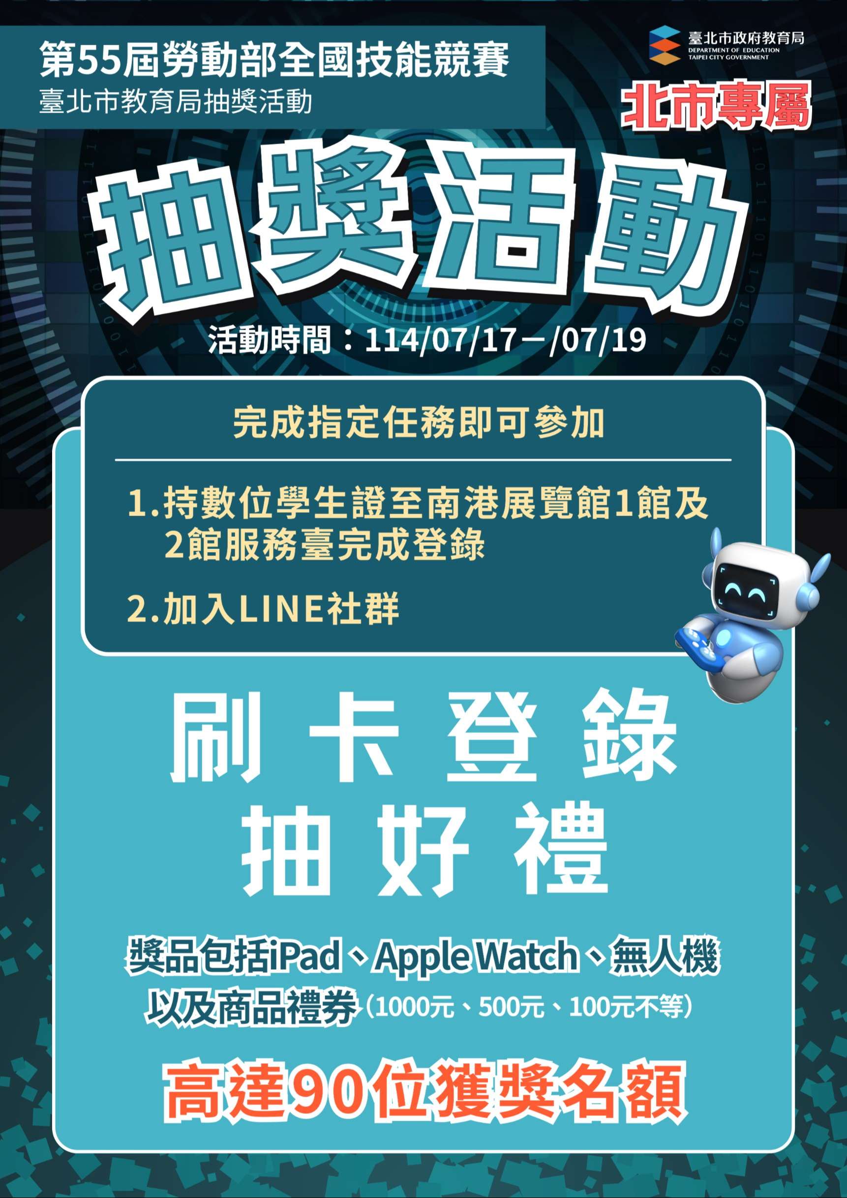 現場提供本市學生限定好禮抽獎活動,凡本市各級學校學生持數位學生證至南港展覽館1館及2館,至大會服務臺完成登錄即可參加抽獎,獎品包括平板電腦、智慧手錶、無人機、以及商品禮券(1000元、500元、100元不等),高達90位獲獎名額。