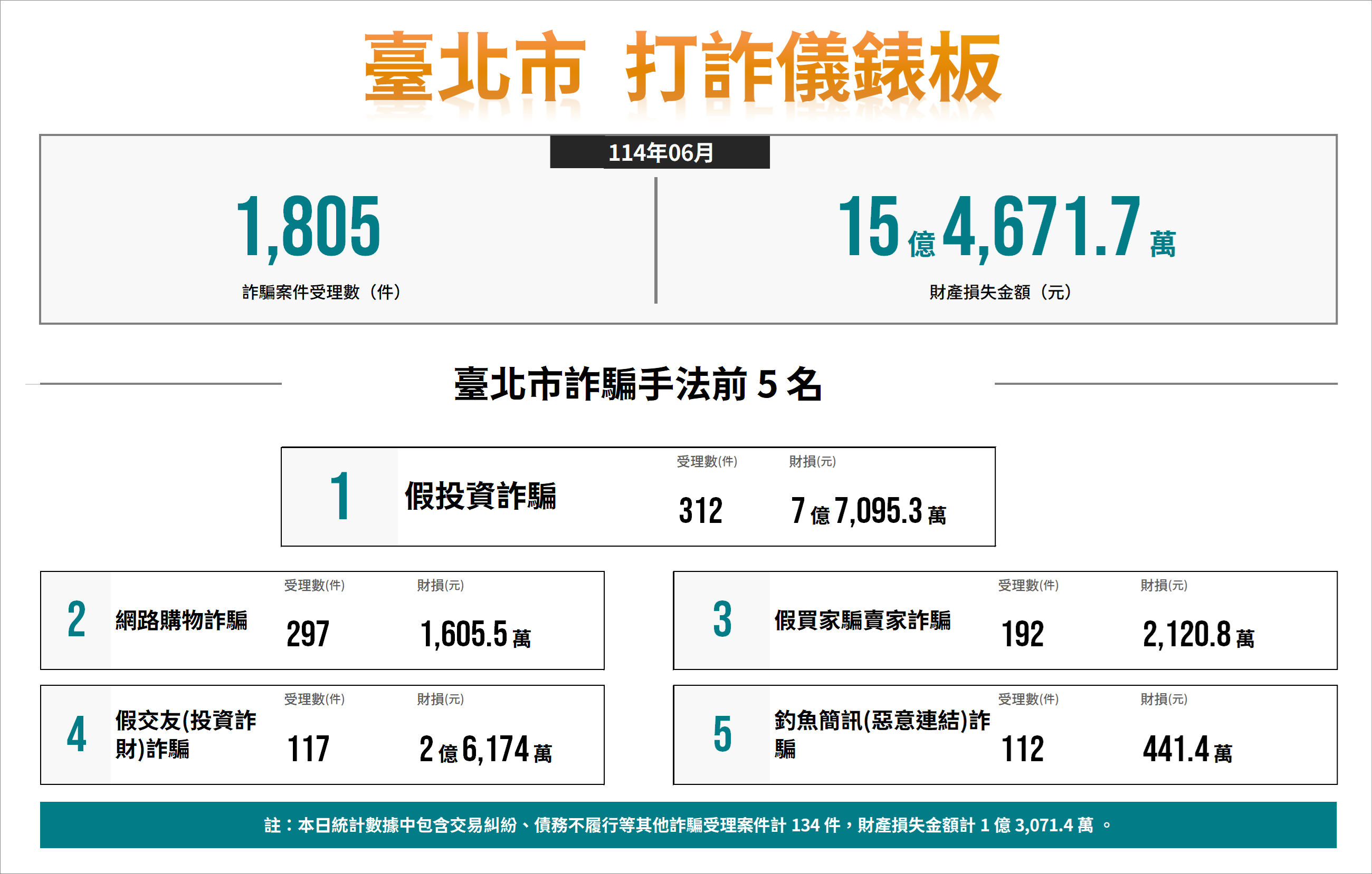 二、經分析本市114年6月各類詐欺案件發生數共計1,805件,財 損金額新臺幣(以下同)15億4,671.7萬元,前3大高發詐 欺手法受理件數及財損金額: