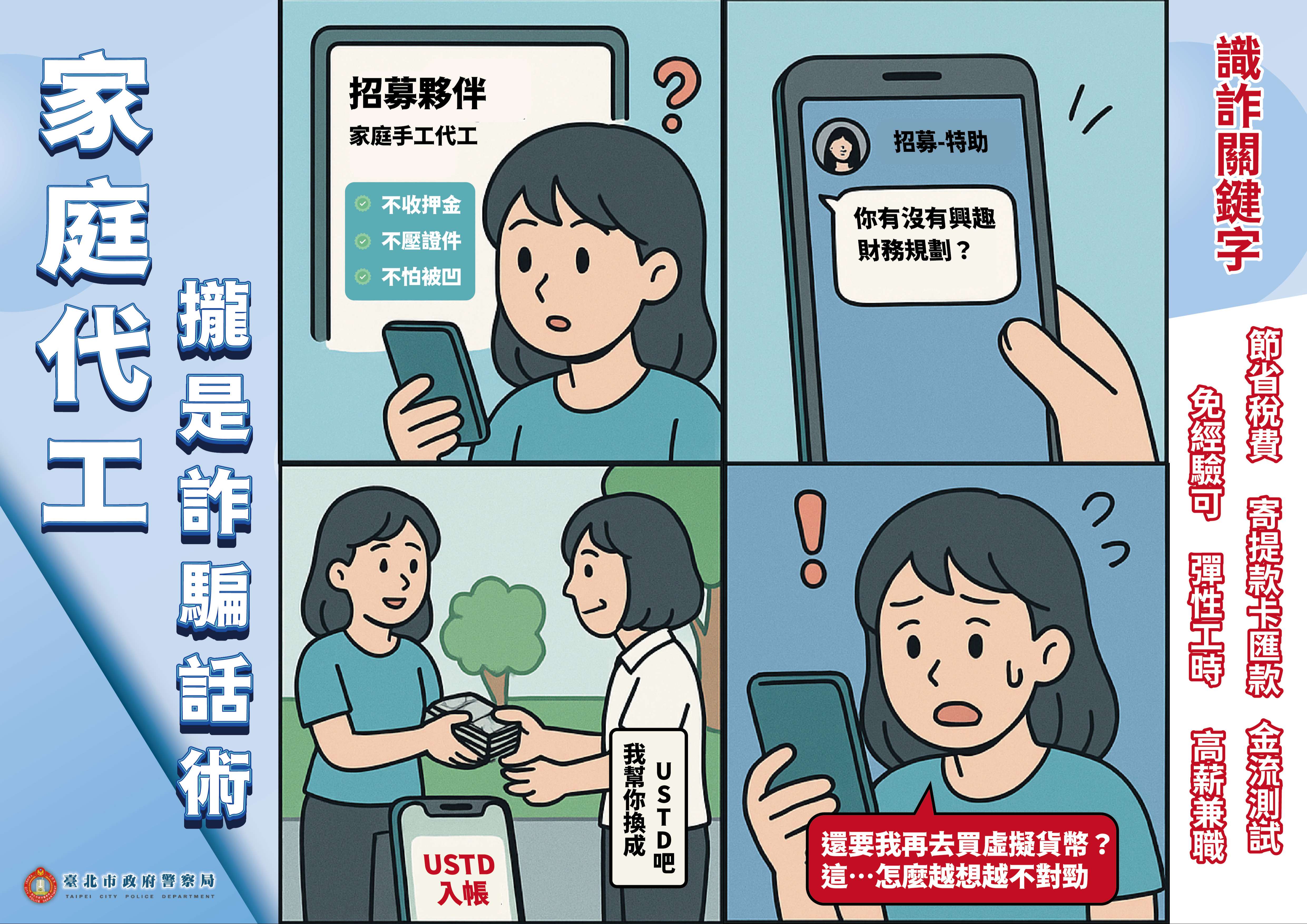 三、因應前3大高發詐欺手法,近期發現詐騙集團常用「假冒買 家騙賣家」及「以詐騙手法引誘被害人投資」等方式,誘導民眾匯款或轉帳遭騙,彙整防詐宣導圖文素材,提醒民眾提高警覺。